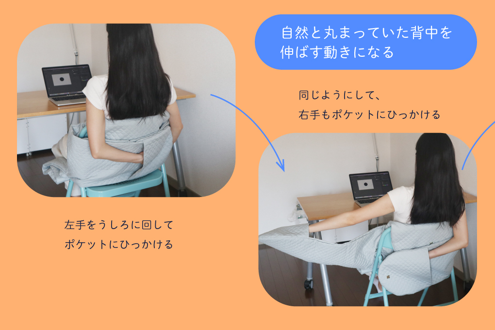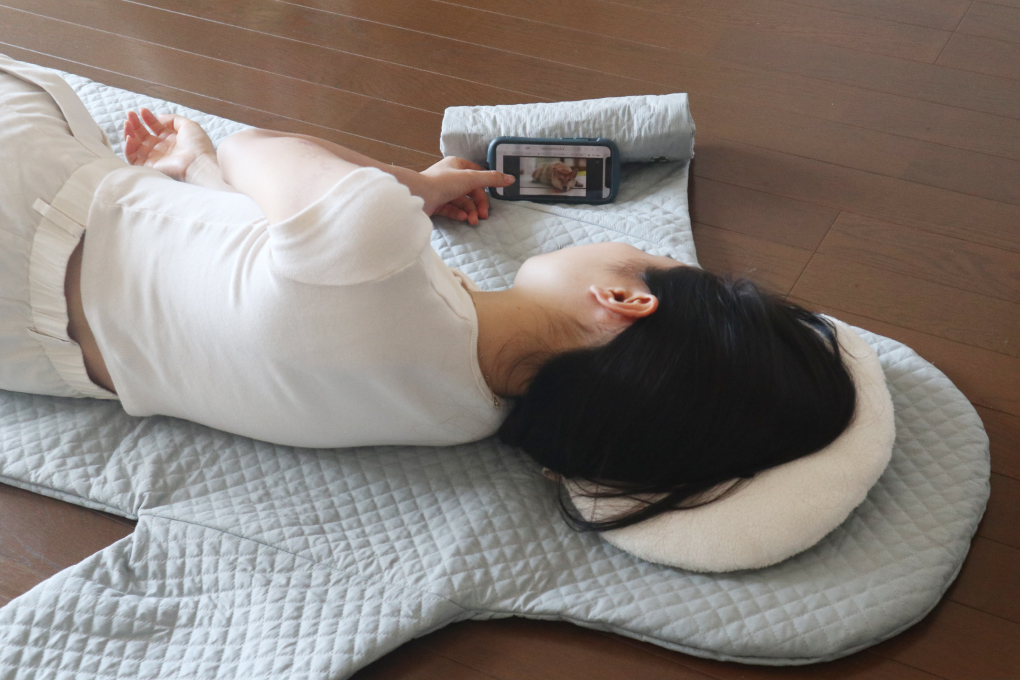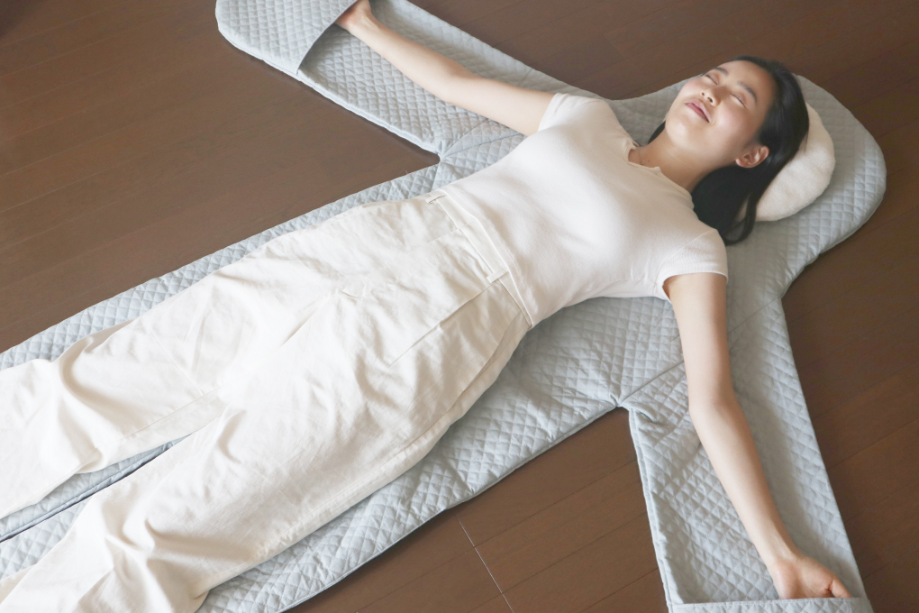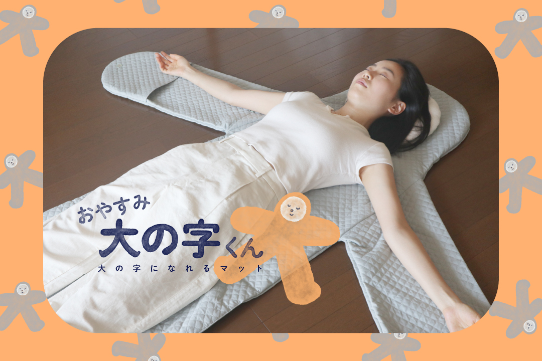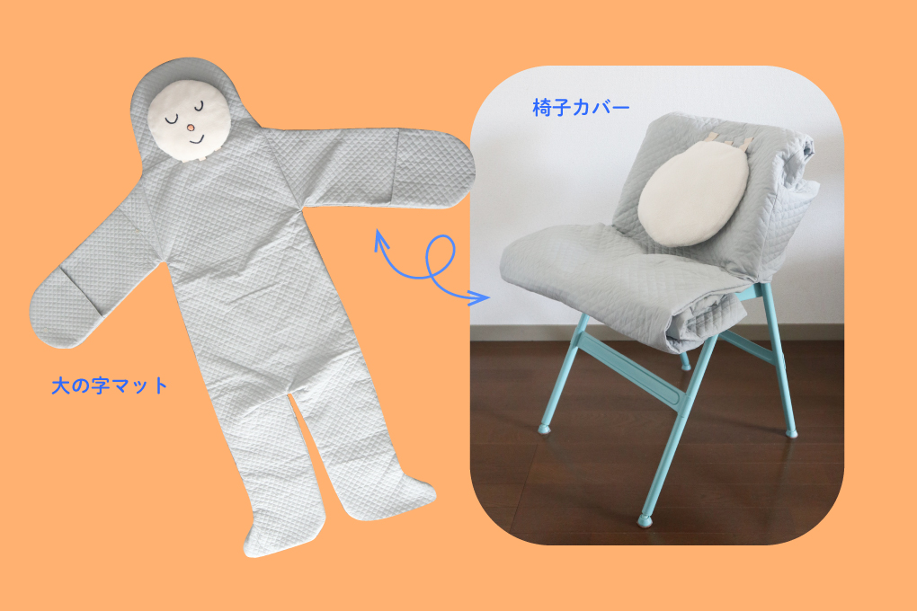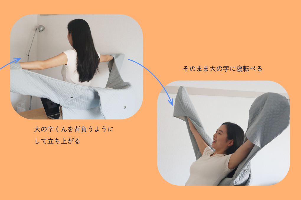 おやすみ大の字くんは、仕事からリラックスへ切り替わる瞬間をさらに楽しくする、大の字型のマットです。仕事中は椅子カバーとして、リラックスする時は大の字型のマットとして使うことができます。椅子に座った状態から、両手を背もたれのうしろに回し、大の字くんを背負うようにして立ち上がることで、スムーズに大の字になることができます。リモートワークによって仕事と休息の境目が曖昧になった今、休息へ切り替わるスイッチとして、思いっきり大の字になってみてはいかがでしょうか?一日一回大の字になることで、パソコンやスマホで丸まった背中を伸ばし、血のめぐりをよくする効果もあるのです。