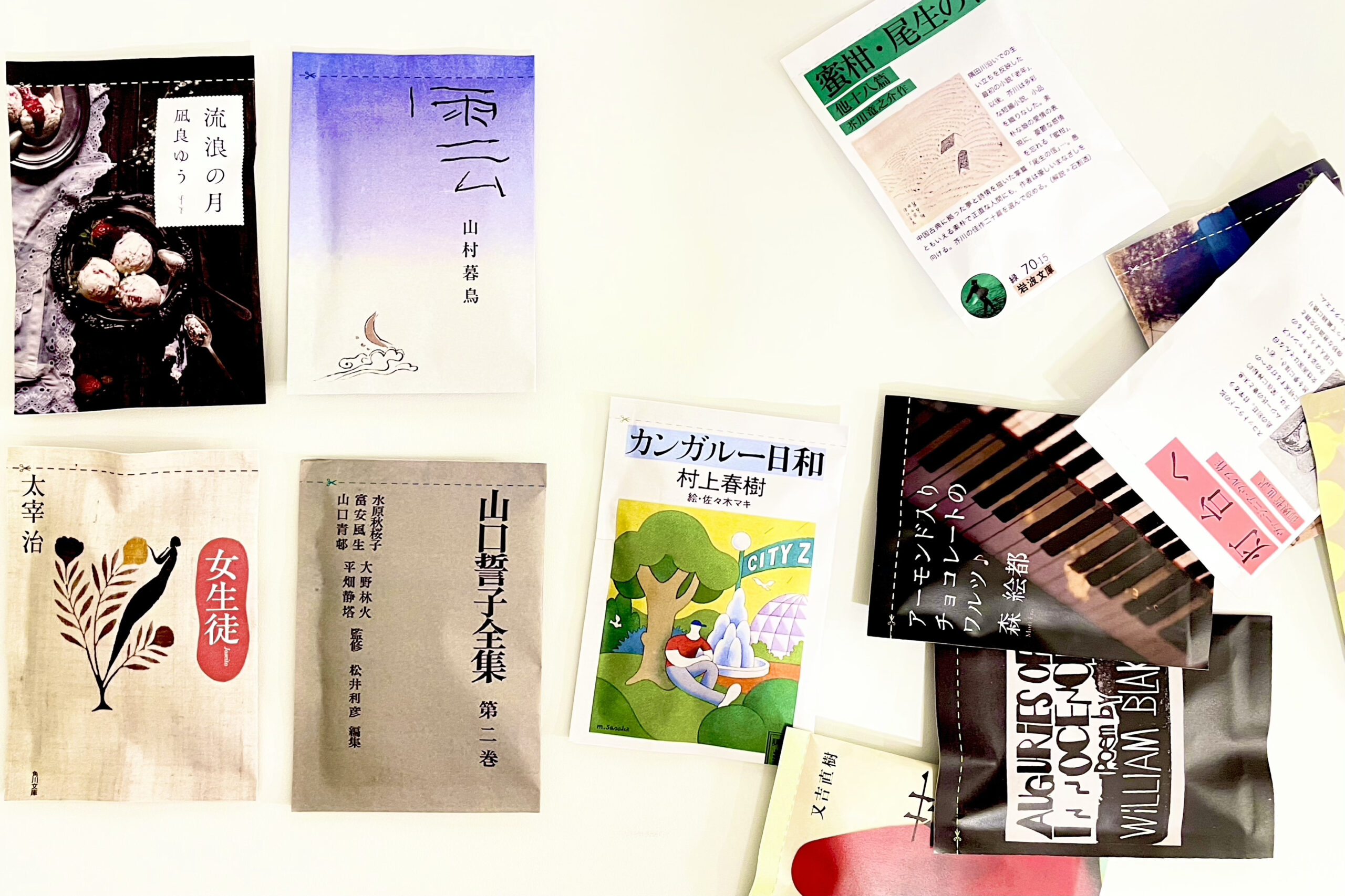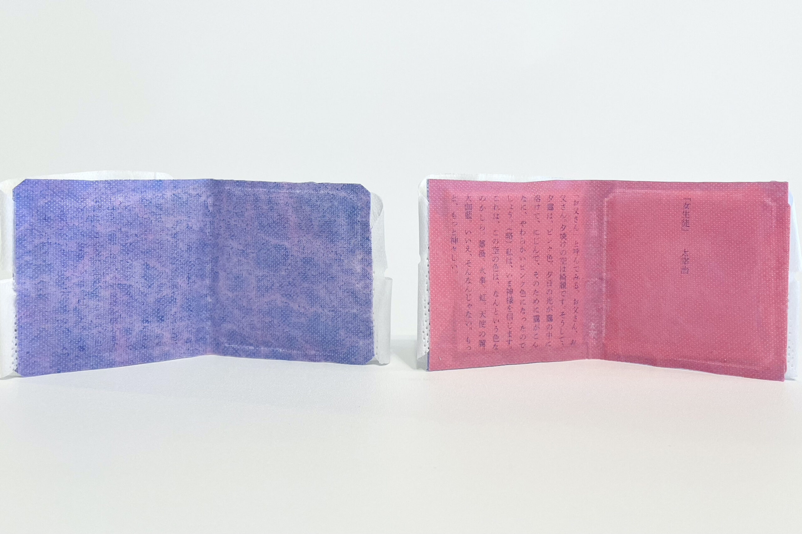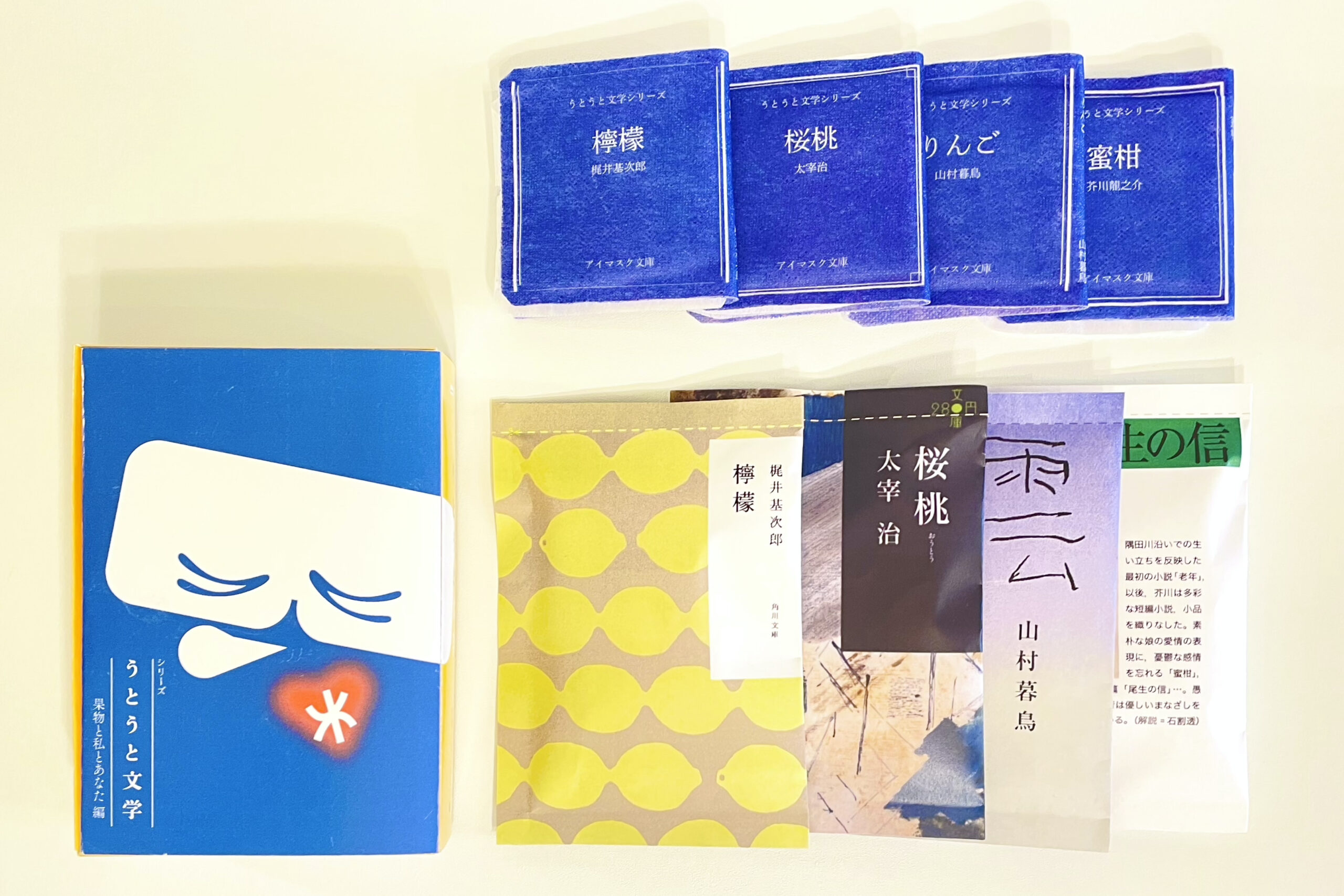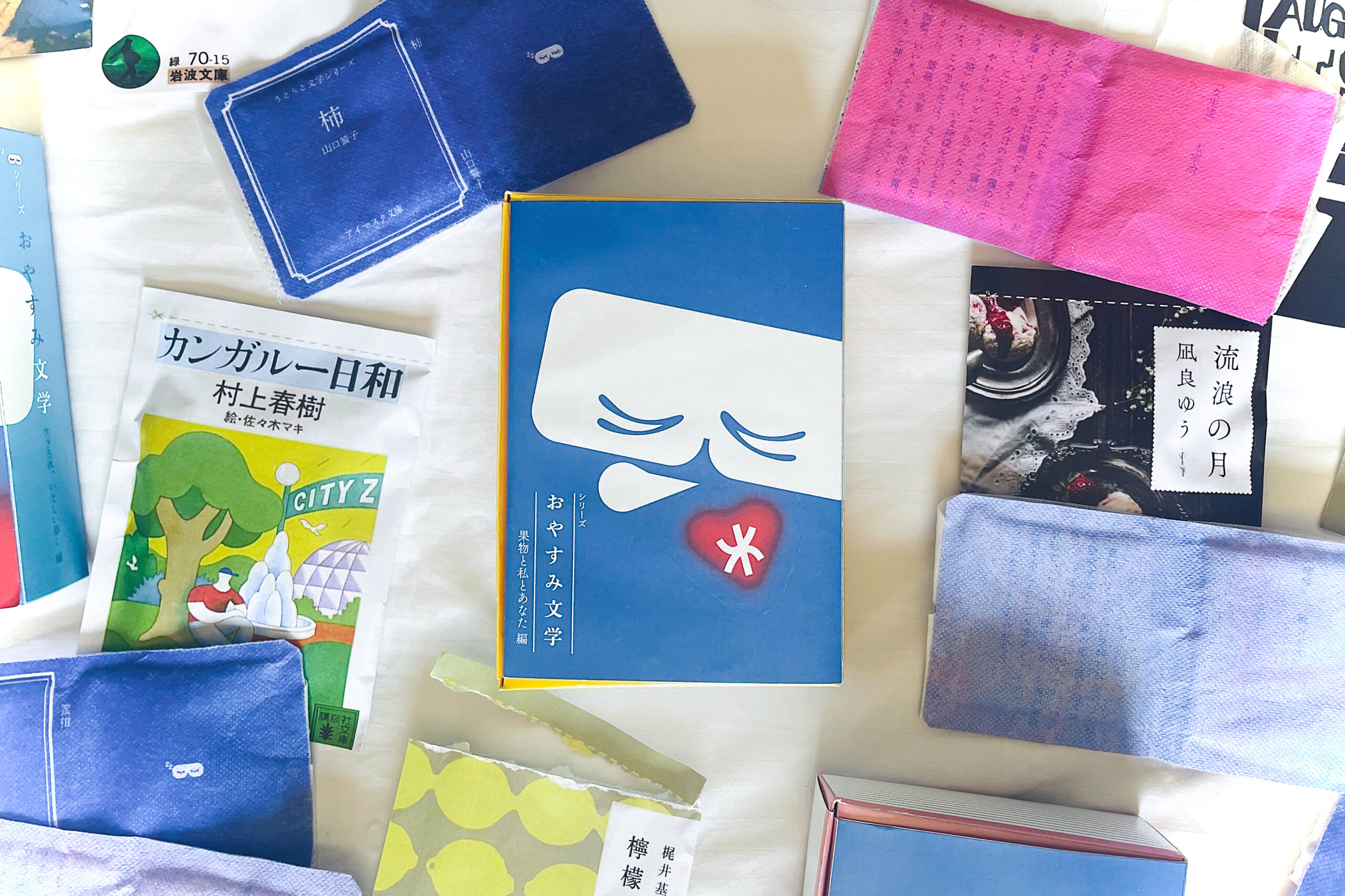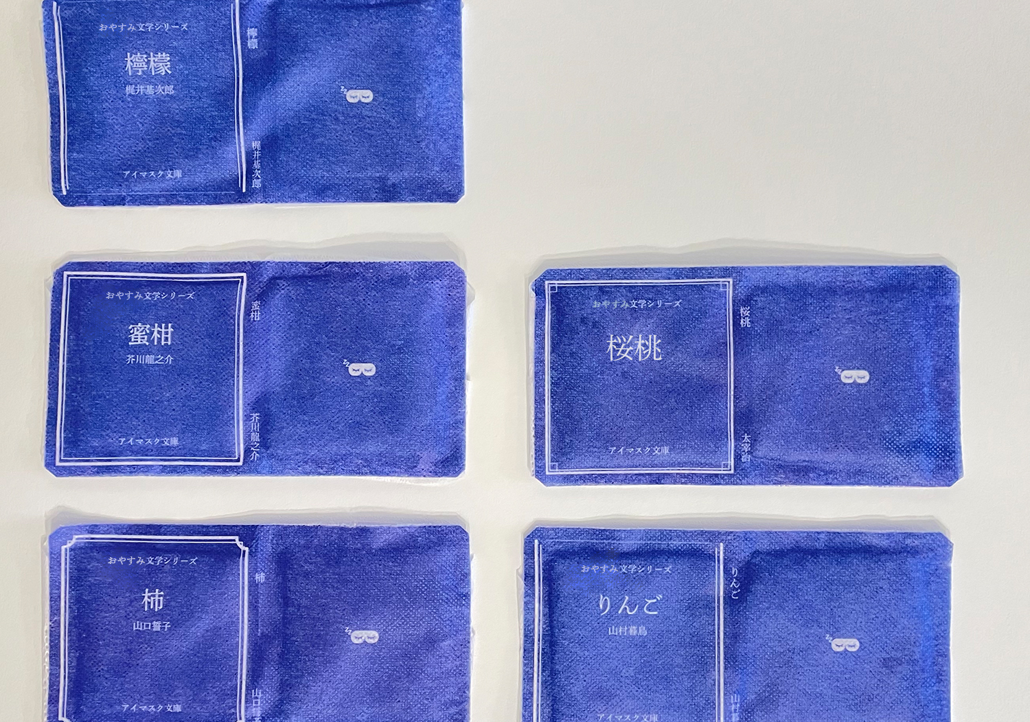 アイマスクには一つ一つ異なる文学が記されており、使用するたびに新しい出会いを与えてくれます。個包装パッケージには実際の装丁をほどこし、数々の本の中から自分に合った一冊を選びとる体験ができます。