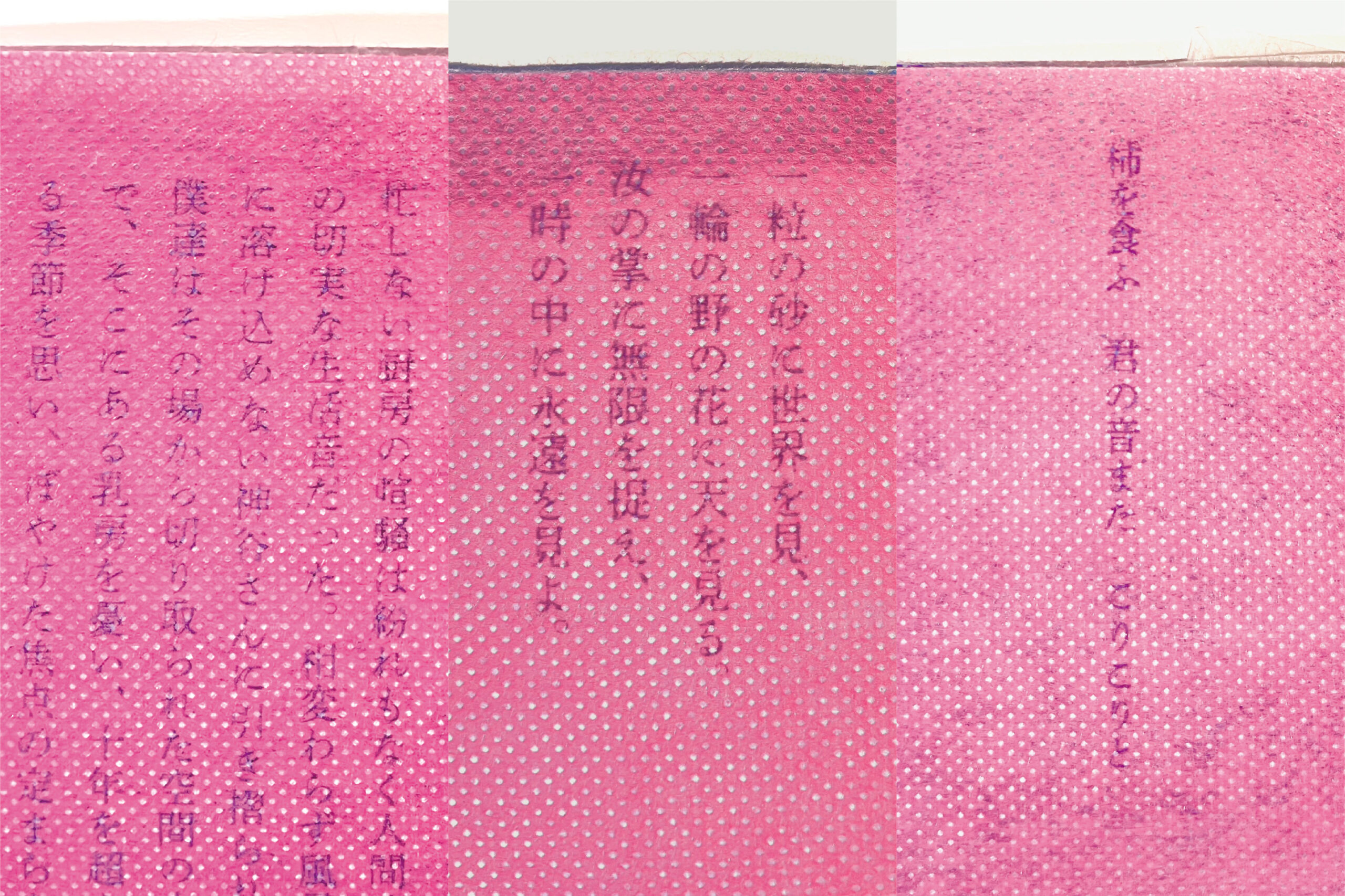 心地よい温度までアイマスクが温まると、そのサインとしてほんの数十秒で読める詩・短歌、小説の一節が浮かび上がります。疲弊した心を慰める言葉や、美しい情景を連想させて安らかな夢へ導く言葉と出会わせてくれます。起床時、捨てる前にもう一度読むことで心の軽い一日をスタートできるかもしれません。