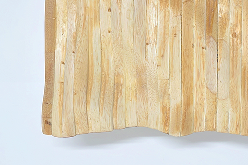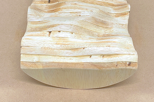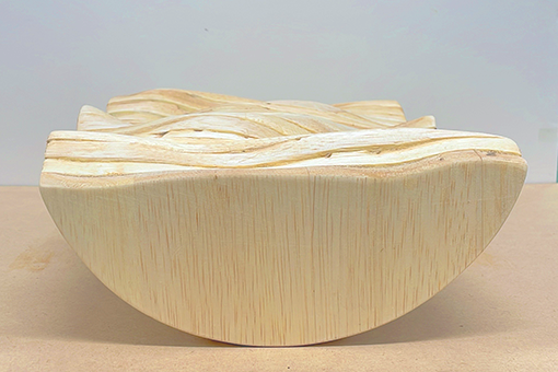 私の作品は、“足元分の海”を謳ったフットレストです。揺蕩う波をそのまま切り抜いたような形を木で表現し、一人分の足の凹凸に合うようデザインしました。柔らかい素材の木を用い、やすりがけをした後に、オイルで仕上げをしています。足を安心して預けることのできるフットレストが多い中、このフットレストは安定しません。自分でバランスを取らなければなりません。机に向かっていると、足が手持ち無沙汰になってしまう、という悩みを聞いた私は、そんな足に仕事を与えてはどうかと思いました。バランスをとるという仕事です。同じようにバランスをとることで、集中力を高める椅子があるように、適度な集中力を維持する効果があります。足を乗せている状態でも乗せていない状態でも、きっとあなたの部屋の一部としてなじむのではないでしょうか。